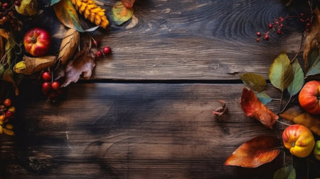 Autumn background with leaves and berries on wooden board, copy space