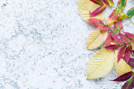 Bright yellow and red autumn leaves on grey background with copy space for text. Beautiful autumn frame. Top view.