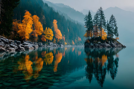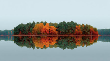 An island with autumn trees and foggy lake reflection in calm water during morning