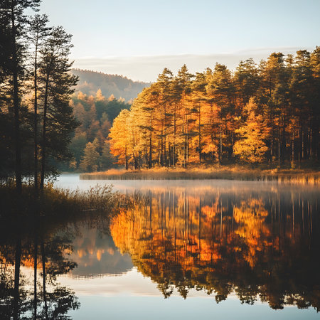 A peaceful lake mirrors vibrant fall foliage, showcasing shades of orange and yellow on a misty morning.