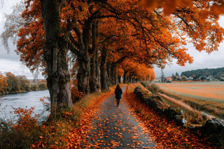 A person walks down a quiet path surrounded by trees with vibrant orange leaves. The river flows nearby, creating a peaceful autumn scene.