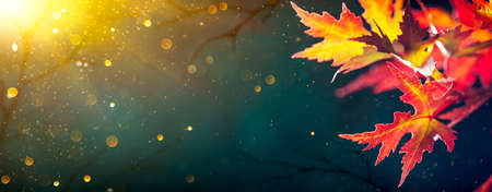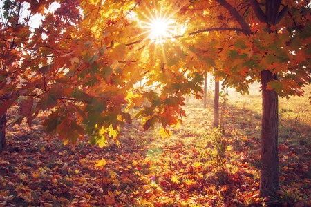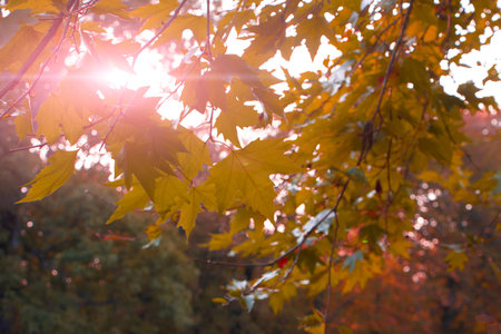 Colorful autumn background. Sun through yellow and red leaves of tree in sunrise. Autumn nature. Colorful tree in bright sunshine. Amazing view on falling autumnal tree with sunbeams