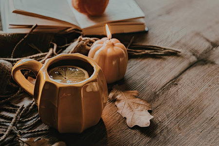 A warm and inviting still life arrangement featuring a small pumpkin and fallen leaves on a wooden table.