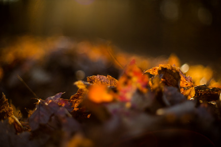 Golden autumn leaves bathed in the warm glow of a setting sun. Serene forest scene.