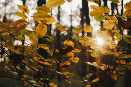 Beautiful evening sun light among autumn leaves in autumn woods. Autumnal background. Beautiful autumn tree branches with yellow leaves in sunset rays in forest