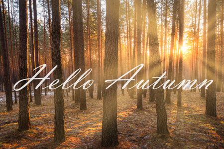 The words Hello Autumn on the background of sunrise in a pine forest. greeting card. The concept of the beginning of autumn season.