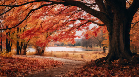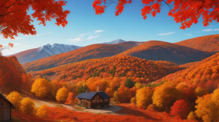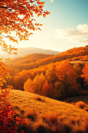 A beautiful autumn landscape with trees in vibrant shades of orange, red, and brown, creating a stunning view