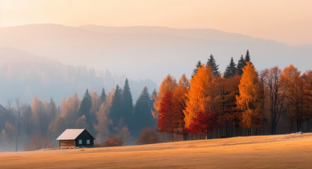 A wooden cabin nestled among vibrant autumn trees with golden leaves, framed by misty mountains during the early morning. The serene landscape showcases nature's beauty as the day begins.