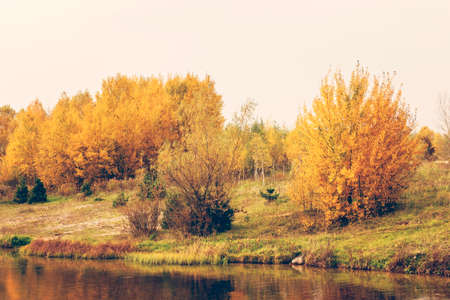 Autumn landscape with lake and trees in the park. Selective focus.