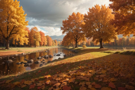 A beautiful river scene with golden autumn leaves reflecting on the water's surface.
