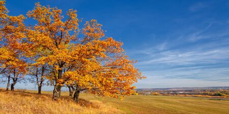 Autumn landscape with yellowed trees in the meadow. Vintage style.