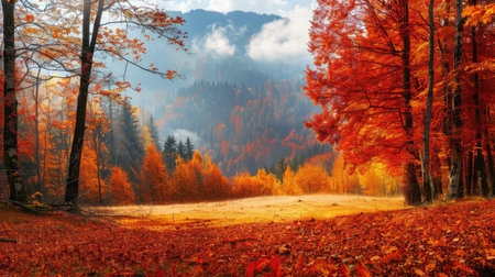 Beautiful autumn scene with vivid red and orange maple leaves in the foreground and a misty forest covered in colorful foliage in the background. The warm hues of fall blend with a soft fog, creating a dreamy, atmospheric landscape perfect for seasonal inspiration.