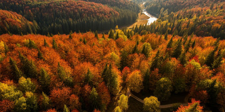 Aerial view of autumn forest and river. Colorful trees in fall season