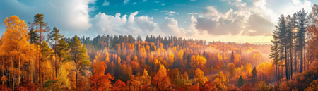 A panoramic view of a vibrant autumn forest with colorful foliage under a dramatic cloudy sky, showcasing nature's beauty.