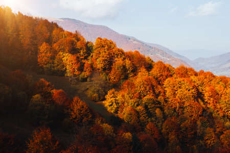 Colorful autumn landscape in the mountains. Sunrise in the forest.