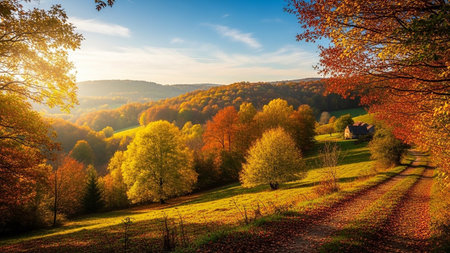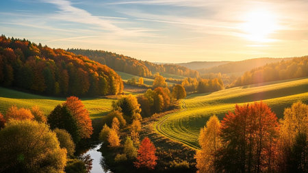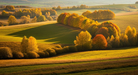 Autumn landscape with colorful trees and fields in the morning light.