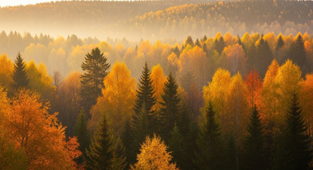 colorful autumn forest in the morning mist. panoramic view