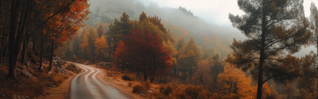 Experience the tranquility of a winding pathway through a forest adorned with brilliant autumn colors, creating a peaceful nature retreat perfect for exploration.