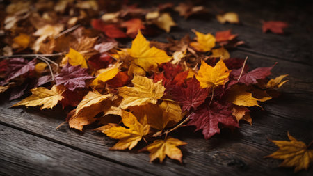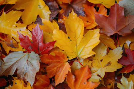 Fallen autumn leaves in various shades of red, orange, and yellow create a beautiful natural tapestry, showcasing the vibrant colors of the fall season