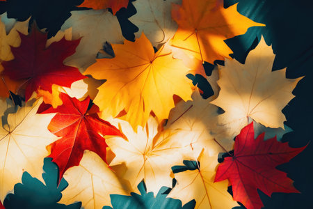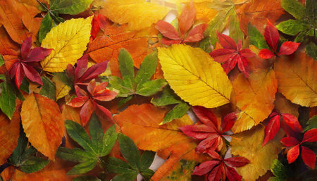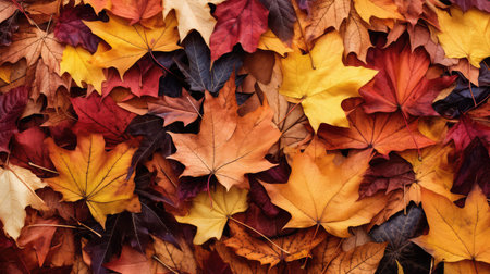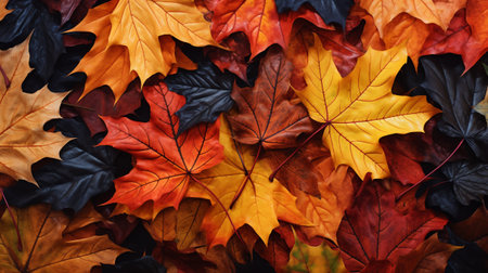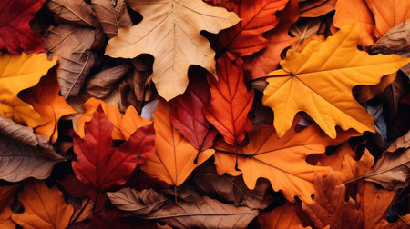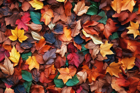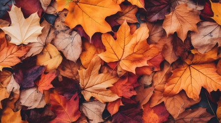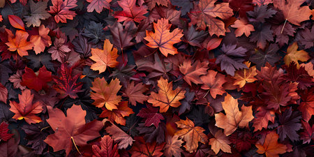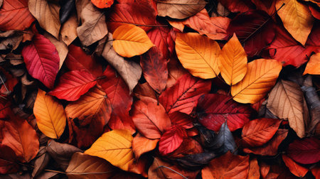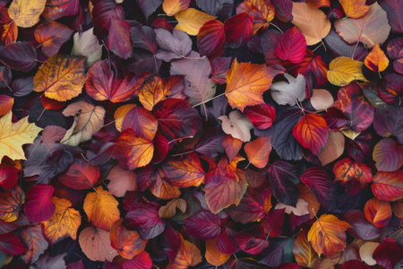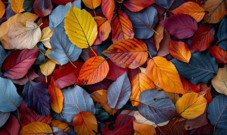 Autumn foliage display vibrant leaves in rich hues, arranged as a blanket, top view, flat lay
