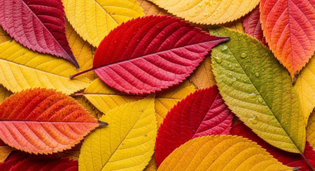 A Colorful autumn leaves with raindrops create vibrant, textured pattern
