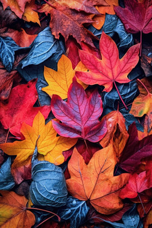 A vibrant collection of autumn leaves in various colors covers the ground in a forest. The leaves showcase shades of orange, yellow, brown, and blue, creating a beautiful tapestry of fall foliage.