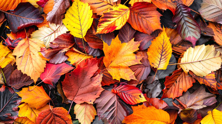 A vibrant assortment of fallen autumn leaves showcases a rich palette of colors, from warm reds to deep browns, creating an inviting natural backdrop.