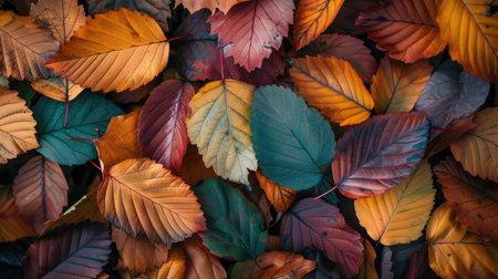 A captivating close-up of autumn leaves in a myriad of warm and deep hues. The vibrant colors and textures create a stunning natural masterpiece.