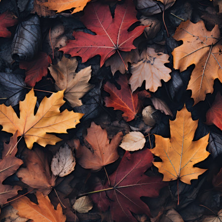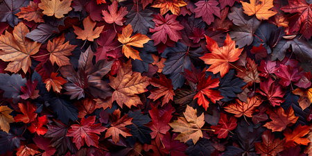 Fallen autumn leaves in various shades of red, orange, and burgundy create a beautiful and textured background, capturing the essence of the fall season