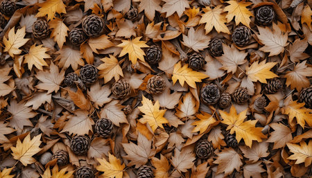 A close-up of a beautiful autumn forest floor covered in fallen leaves in shades of brown, orange, and gold