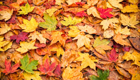 A dense carpet of fallen maple leaves in vibrant autumnal hues of red, orange, and yellow, showcasing diverse shades and textures