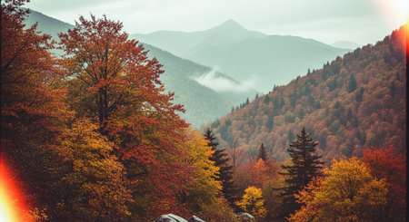 Autumnal mountainside landscape with vibrant fall foliage trees