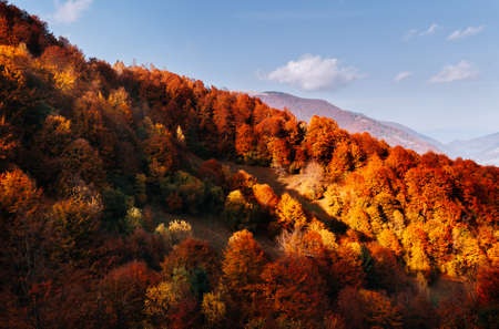Bright autumn forest on a mountain slope. Location place of Carpathian mountains, Ukraine, Europe. Fresh seasonal wallpaper background. Photo of nature concept. Discover the beauty of earth.