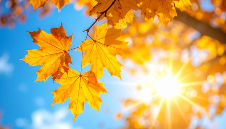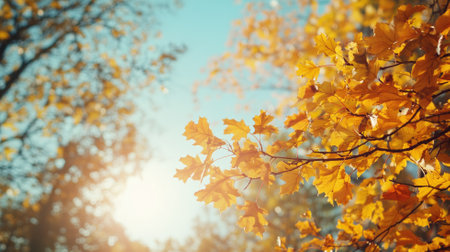Vibrant yellow leaves glow warmly in the gentle sunlight, capturing the essence of an idyllic autumn day. The beauty of nature unfolds in a peaceful moment.