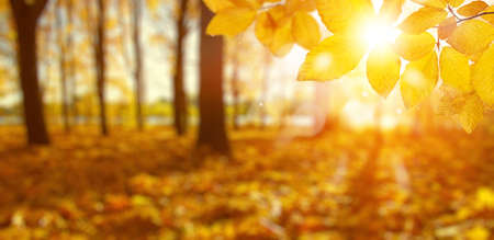 Autumn leaves background. Beautiful nature scene with sun rays and bokeh