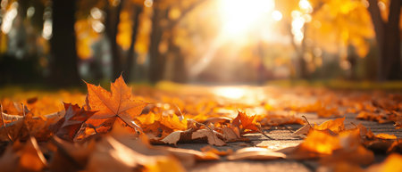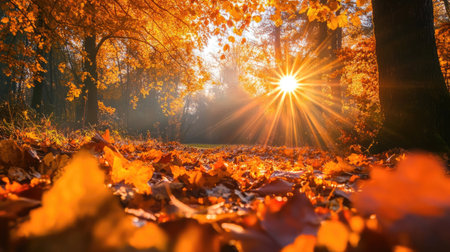 Captivating view of golden autumn leaves scattered on the ground, bathed in warm sunlight, with trees creating a serene backdrop, representing the beauty of fall.