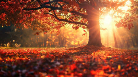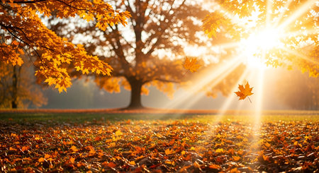 A picturesque autumn scene bathed in warm, golden sunlight. Sunbeams stream through the branches of a large maple tree, illuminating the vibrant orange and yellow leaves. Fallen leaves carpet the ground in the foreground, creating a rich, textured surface.
