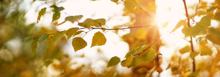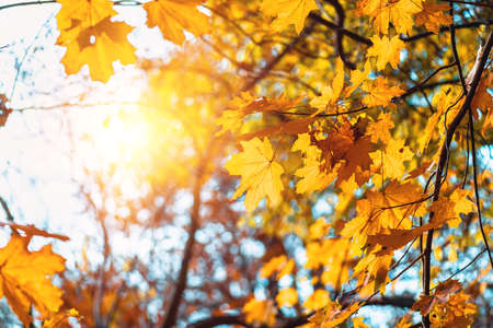 Natural autumn maple leaves on a branch, through which the setting sun shines, background with copy space.