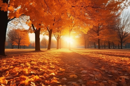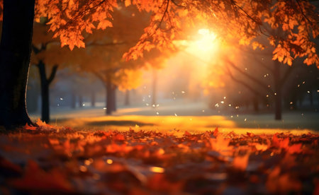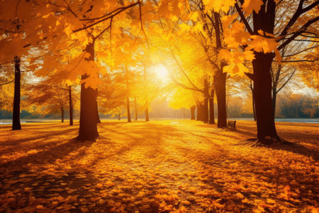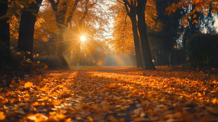 Stunning sunset in an autumnal park. Golden leaves cover the ground, bathed in the warm light.