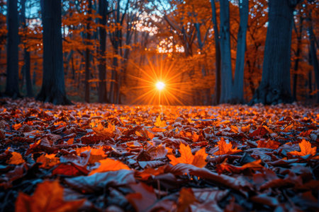 The sun sets over a tranquil landscape, illuminating vibrant autumn leaves scattered on the ground. Trees stand tall, showing their seasonal colors against the warm glow of the evening light.