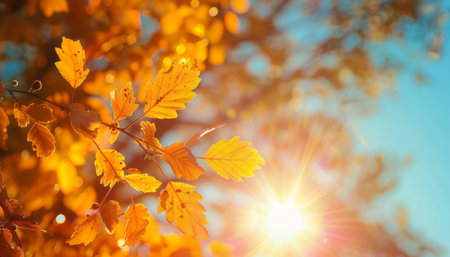 Autumn leaves and sun in the blue sky. Autumn nature background.