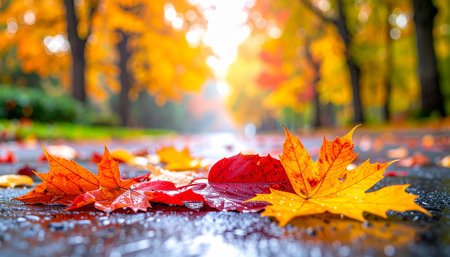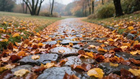 Vibrant autumn leaves scattered on a wet path during a serene fall afternoon