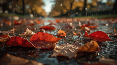 Close-up view of colorful autumn leaves scattered on a wet street during light rainfall. The blurred background highlights the seasonal atmosphere and natural beauty.
