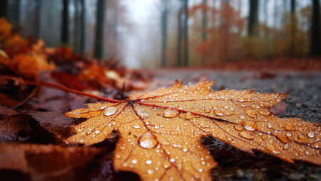 An overhead shot displays an autumn leaf covered with water droplets resting on a dark surface. The leaf's intricate veins are visible, and the background reveals a misty forest. This image showcases rich autumnal colors, which might be suitable for editorial or commercial purposes, such as illustrating articles or creating promotional materials.
