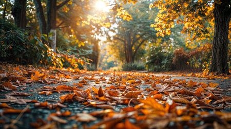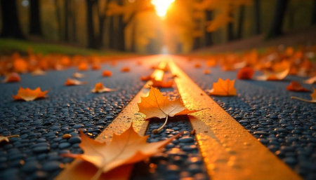 Autumn Leaves Scattered on a Sunlit Asphalt Road