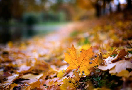 Autumn leaves on the ground in the park. Shallow depth of field