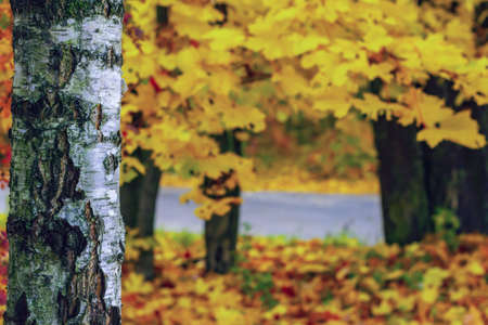 Golden autumn, many fallen yellow and red leaves.Trees in yellow and red foliage.