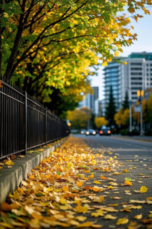 Fallen Leaves on Autumn Streets and Urban Architectural Landscape