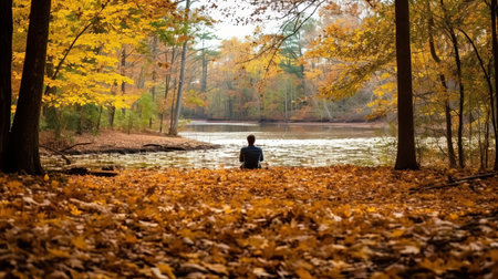 Vibrant fall foliage reflects on the still waters of a forest lake, creating a tapestry of autumn colors in a tranquil natural setting. Resplendent.