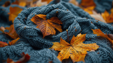 Woolen gray knitted scarf with rolled autumn orange leaves and water drops on top. Cozy flatlay seasonal background for fall, warmth, and nature-inspired designs with copy space.